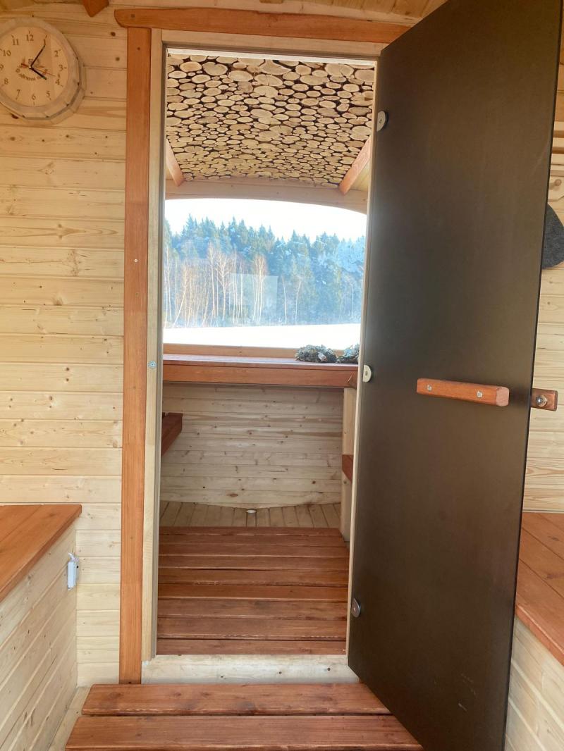 Баня комфортна для одновременного парения в ней до 4-х человек. Комната отдыха оборудована рундуками и двумя откидными столиками. Парная с большим панорамным окном, можевелловым потолочным панно и светодиодной подсветкой. В парной 2 бака для воды: на 55 литров горячей и на 80 литров холодной. Чан диаметром 2 метра, глубиной 97 см, вместимостью 4-6 человек, изготовлен из пищевой нержавейки с отделкой из лиственницы снаружи и внутри, объем воды 1700 литров. В центре чана столик. Есть светодиодная подсветка. Удобная лестница с двумя перилами. Наличие герметичной поролоновой крышки позволяет быстро нагреть воду и оставаться ей горячей до самого утра